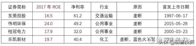 第一种无疑是垄断。垄断可以带来高净利率,这是毫无疑问的,而公用事业公司具有极强的垄断性质,也是巴菲特老爷子的爱股。在选出来的32家公司里,东莞控股是高速公路收费、伟明环保是垃圾焚烧发电,桂冠电力是发电,乐凯新材是蓝色火车票供应商,基本属于垄断地位,因此四家公司的净利率分别为61.2%、49.2%、32.0%和40.4%,其对应的ROE也分别为16.5%、24%、17.9%和19.7%。